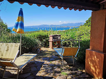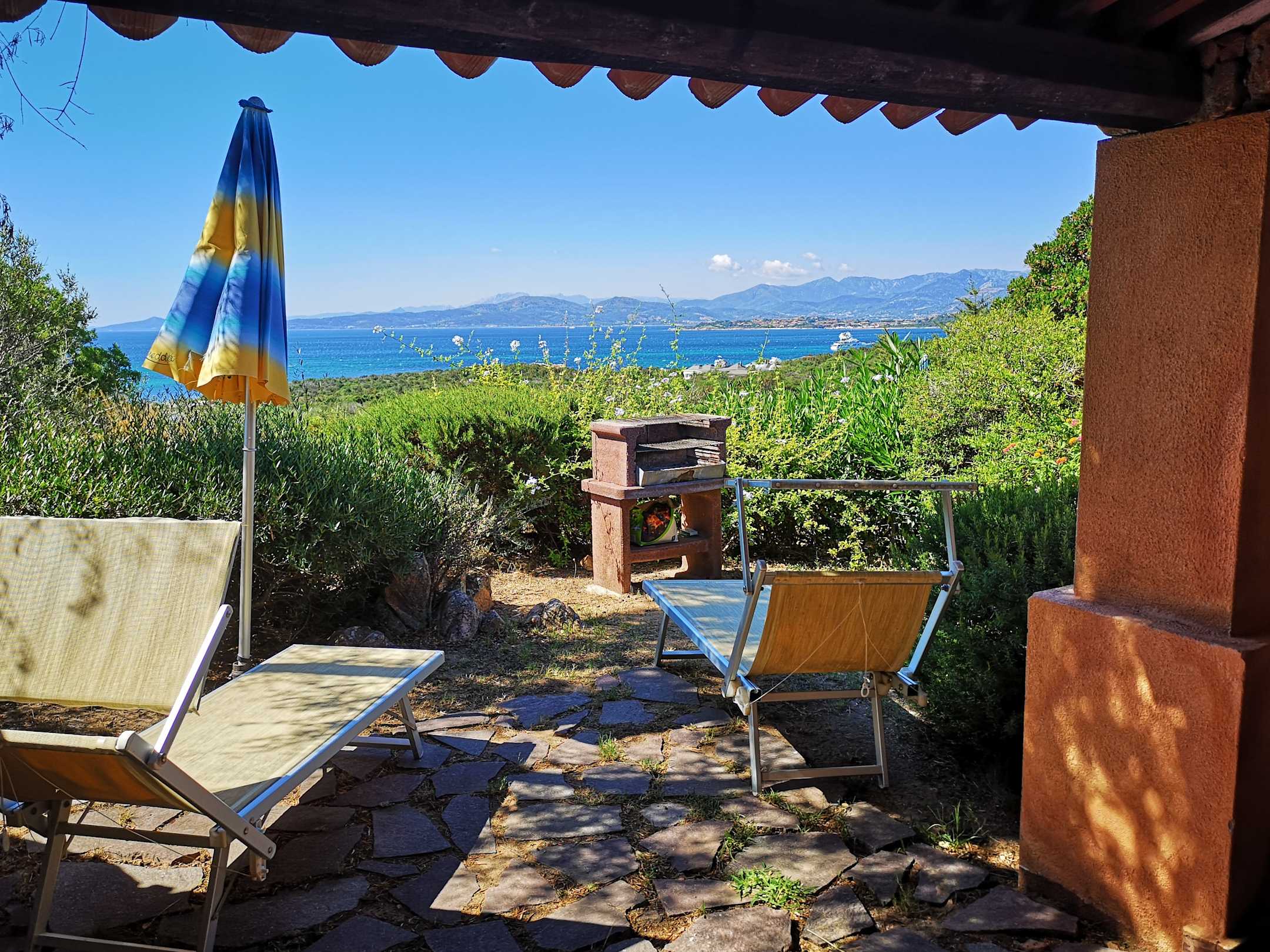 AußenansichtWohnung Nr. 19 - Aussicht aus der Terrasse mit Grill. Die Natursteinplatten auf dem Boden sind lose verlegt.