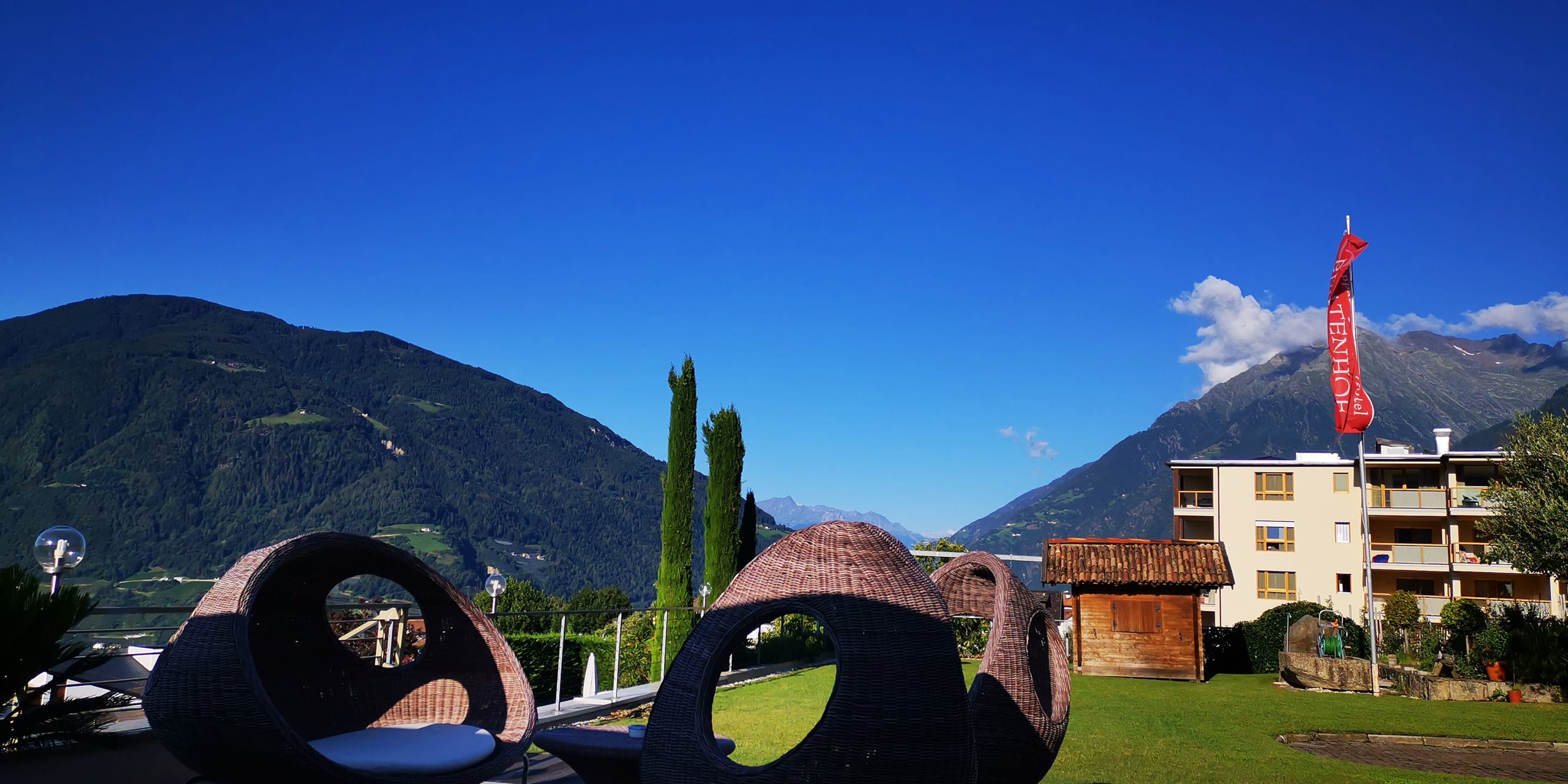 Blick in den Garten beim Frühstück auf der Terrasse