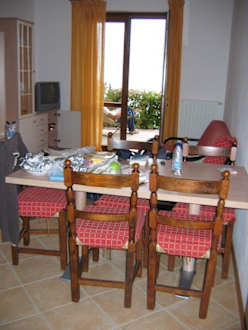 Wohnzimmer mit großem Esstisch und Terrassenzugang