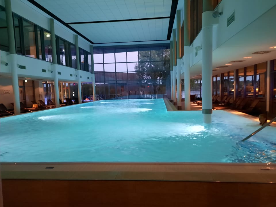 Schwimmbad im Wellnessbereich. Foto als es leer war. Meistens ist es recht belegt und Bahnenschwimmen nicht gut möglich. Ärgerlich ist es, dass Teilbereiche an allen Tagen für längere Zeiten mit Schwimmkursen oder Aquagymnastik belegt waren