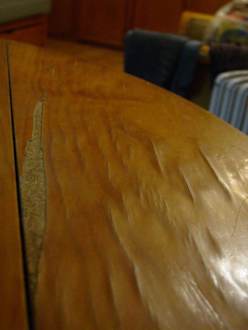 Aufgequollener Tisch im Wohnzimmer von Apartment Nr. 9. Gebucht war das Delfin Mar bei Bucher Reisen, 4 Sterne laut Ausschreibung.