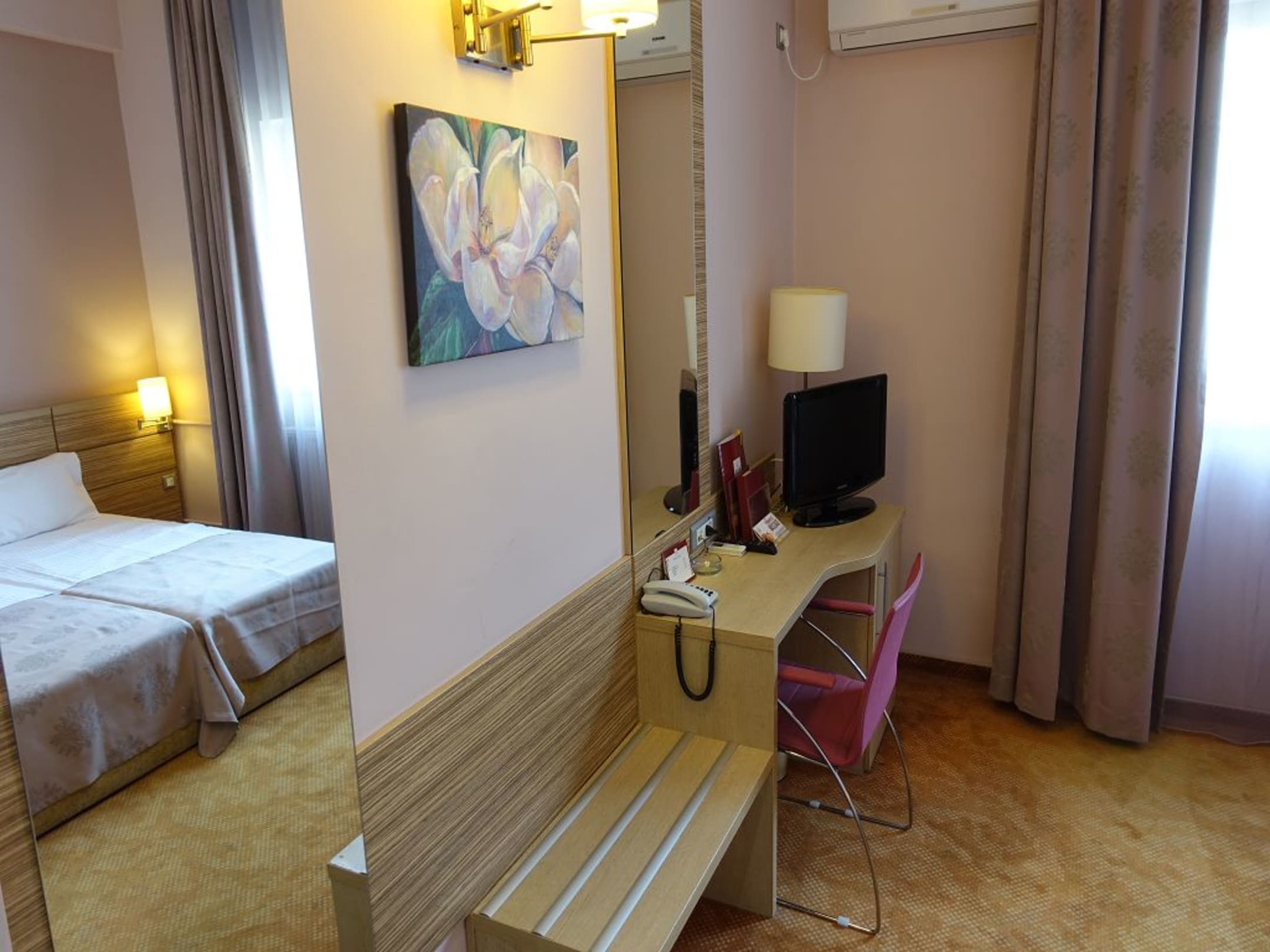 ZimmerZimmer mit sehr kleinem Fernseher (ohne deutschsprachige Programme) und kleiner Ablage für einen Koffer.