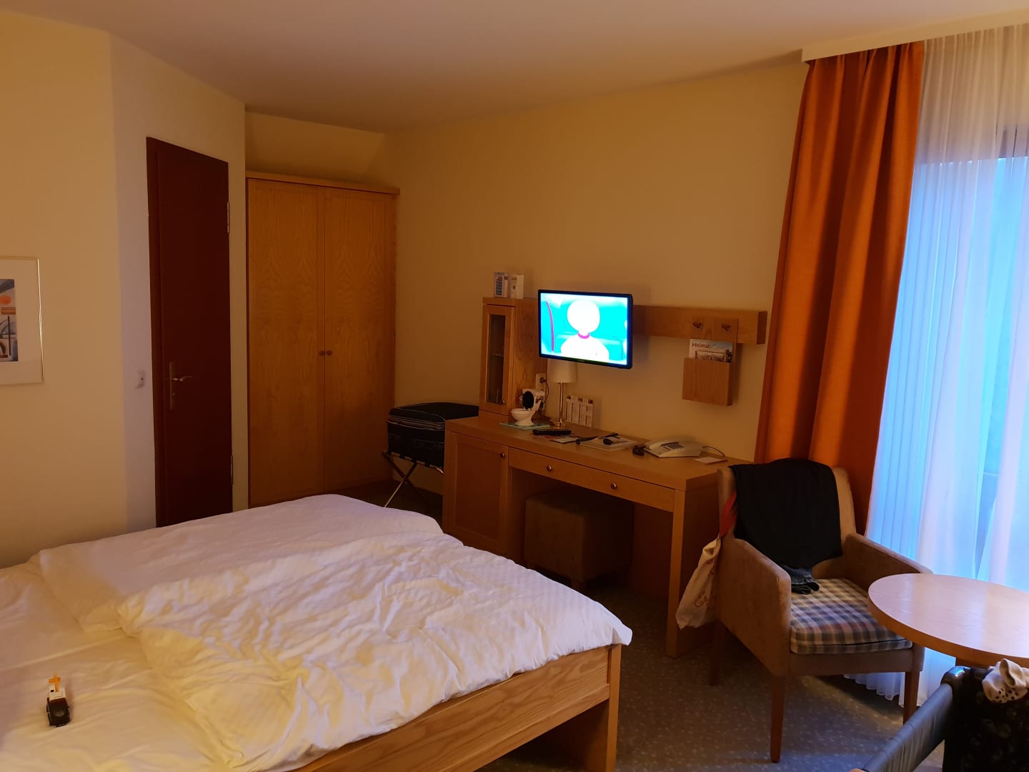 ZimmerEin großer Kleiderschrank mit Platz für 2 voller Koffer, sowie ein Fernseher mit den geläufigsten Sendern.