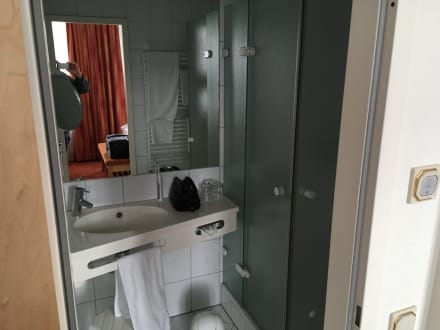 Bad Zimmer 214, die Toilette befindet sich rechts neben der Dusche