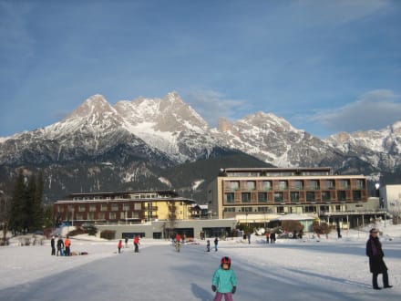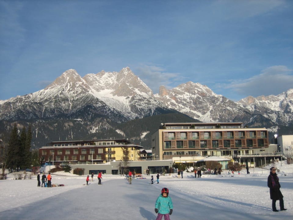 Vom zugefrorenden Ritzensee blickt man hier auf das Hotel, rechts der Teil "Hotel am See, bzw. Superior", links das Haupthaus (deLuxe),