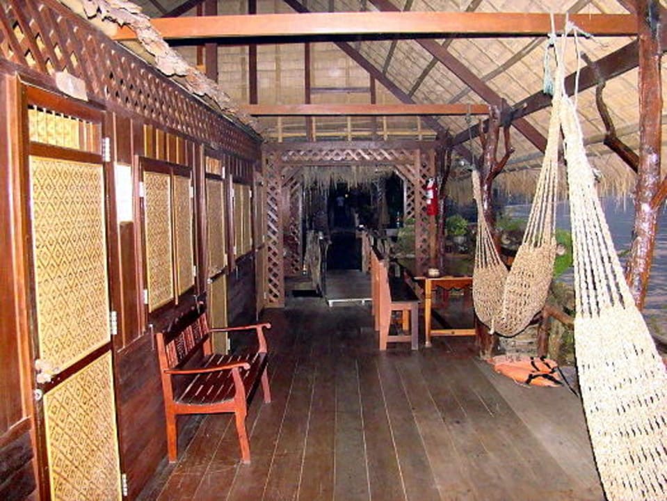 Links die Zimmer auf den einzelnen Flößen und rechts geht es an der Hängematte vorbei direkt auf die Fluß-Terasse, die zu jedem Floß gehört