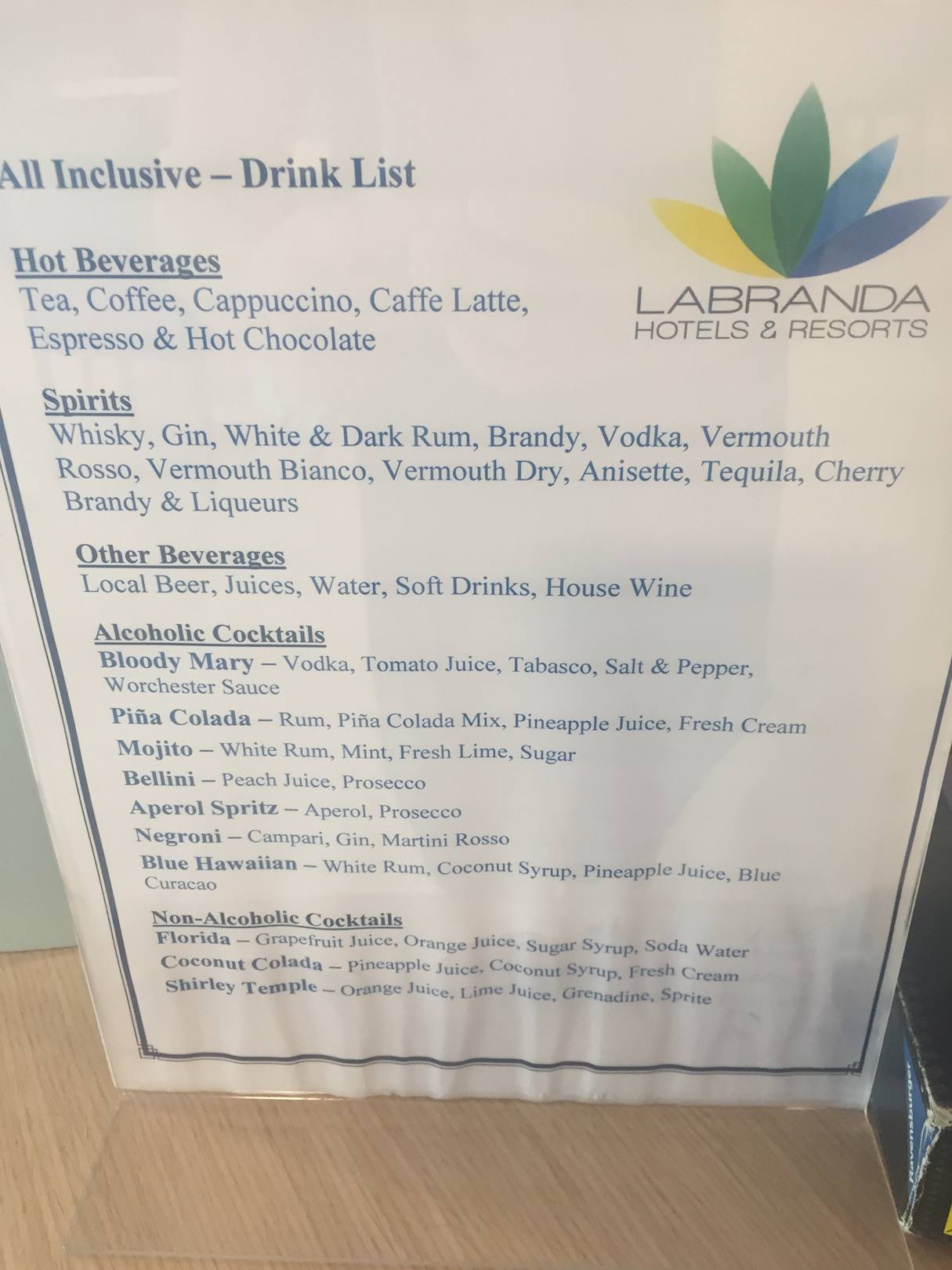 Das ist die Liste der Getränke für das Ultra All inclusive Paket