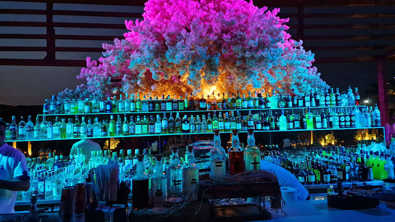 Auswahl an Getränken an der Strandbar, es gibt unzählige Alkoholische Getränke mit internationalen Alkoholika, Cocktails ohne Alkohol und man bekommt snacks und frisch aufgeschnitten Früchte zu seinen Getränken.