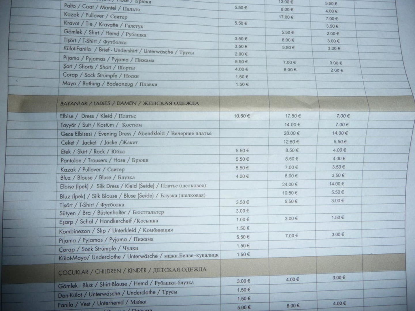 Preisliste Wäscheservice