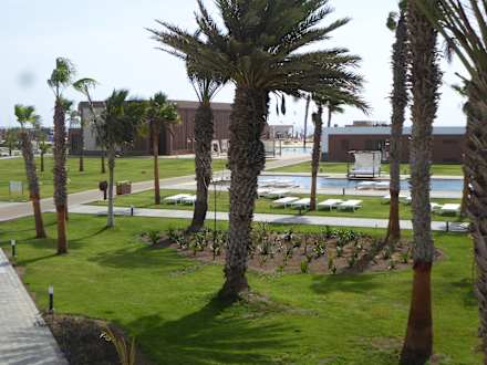 Blick in den Gartenbereich: in der Bildmitte erkennt man den Hauptpool; im Hintergrund (direkt neben dem großen WellFitSpa-Bereich) befindet sich der 33 m lange Activity-Pool mit Blick auf das Meer