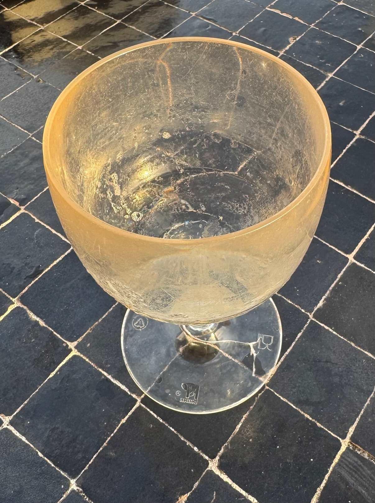 StrandGlas an Strandbar. Wenn das Glas einen Riss hat, tauscht man es aus. Genauso wenn sie so alt und verkratzt sind vom Spülen.