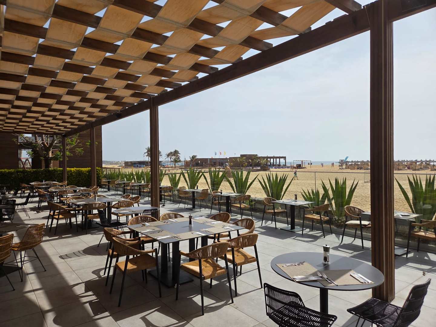 Blick von der Frühstücksterrasse zum Strand
