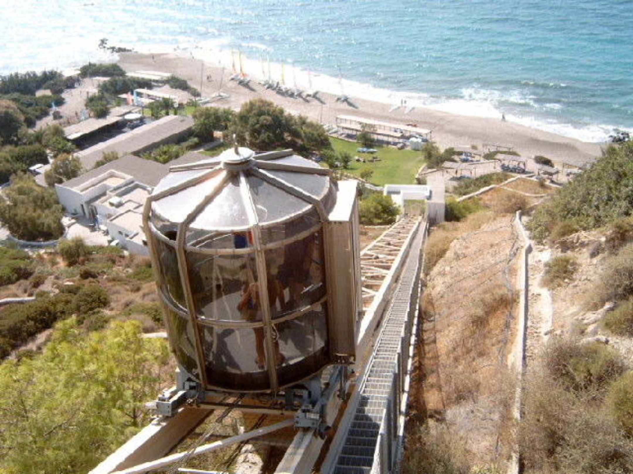 Der Aufzug zum StrandMit diesem Aufzug ist der Höhenunterschied zum Starnd gar kein Problem. In nur einer Minute ist man am weißen Sandstrand.