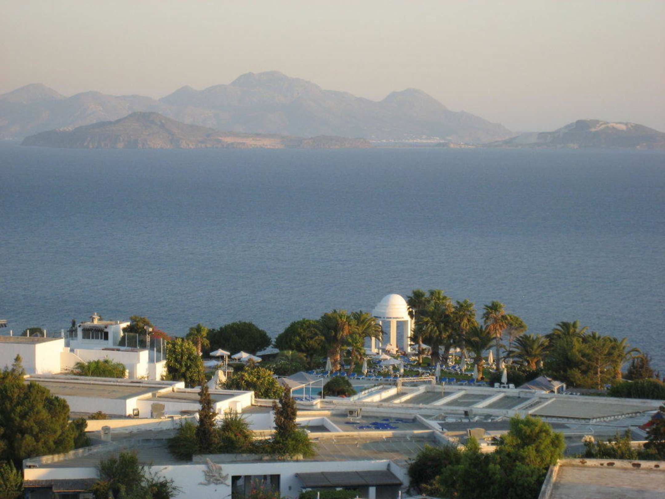 Der Robinson Daidalos Club in früher Abendstimmung, von den Tennisplätzen aus fotografiert. Im Hintergrund die Insel Nissiros, die sicherlich einen Tagesausflug Wert ist. (Die kleinen Ausflugsboote fahren vom Ort Kardamena ab)