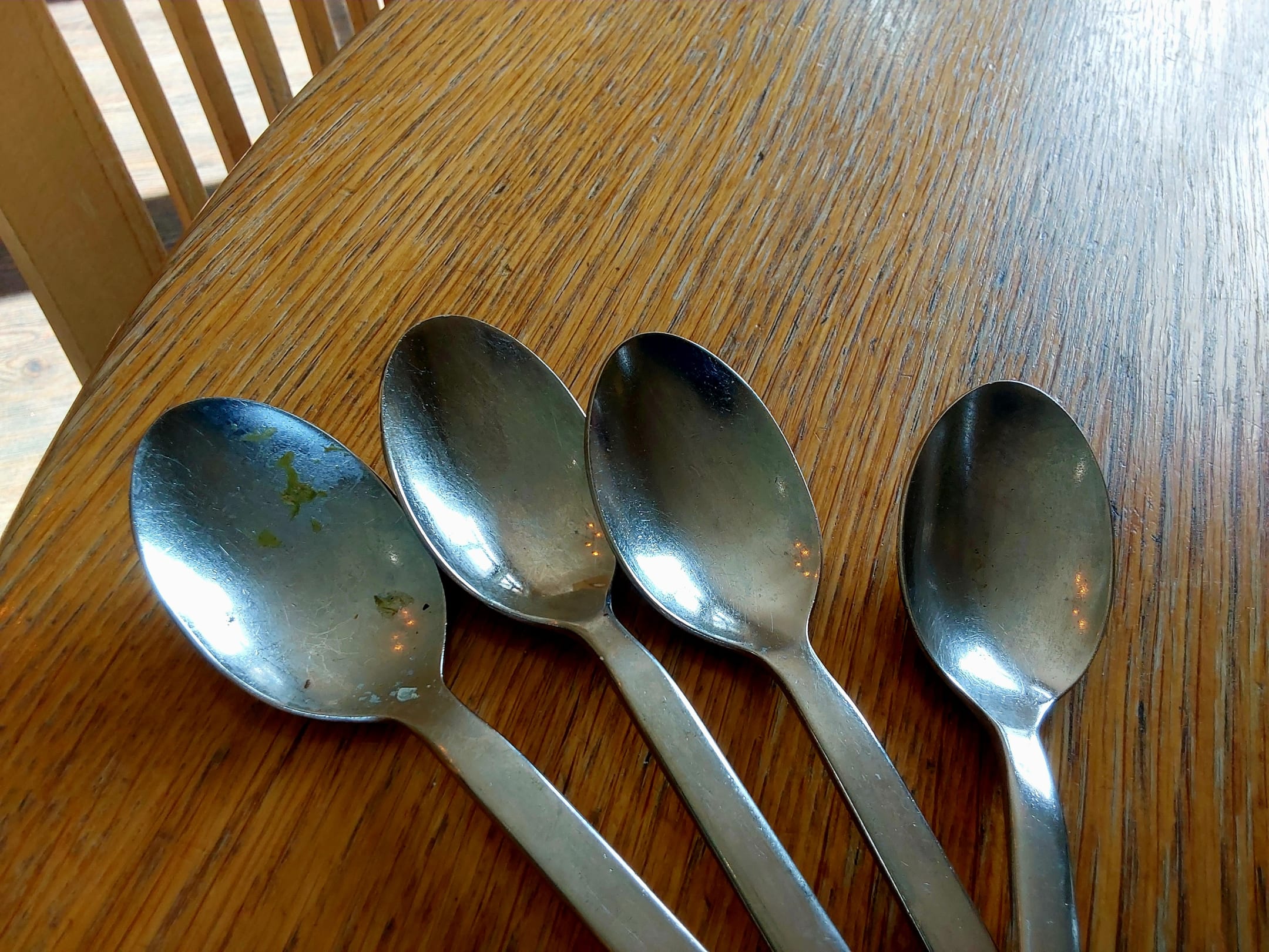GastroVier schmutzige Eßlöffel die als frische Eßlöffel auf dem Besteckteller auf dem Tisch im Speisesaal lagen.