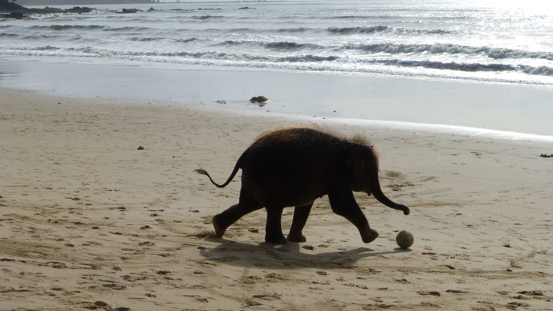 Hoteleigener Babyelefant beim Fußballspiel am Strand