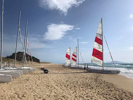 Katamarane der Wassersport-Station am Strand, ab hier kommt man nach ca. 5km entlang am traumhaften Strand nach Arkoudi, einem kleinen Örtchen mit ein paar Restaurants und Supermarkt.