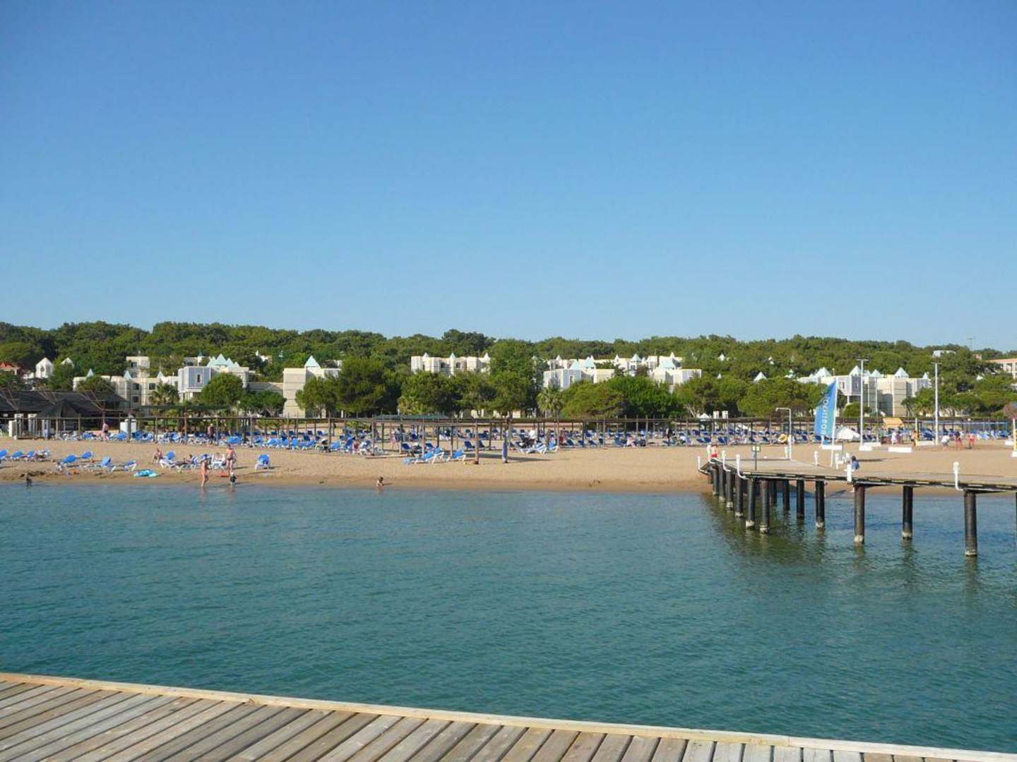 Man sieht heir vom Steg aus den Strand und die Hotelanlage sehr gut