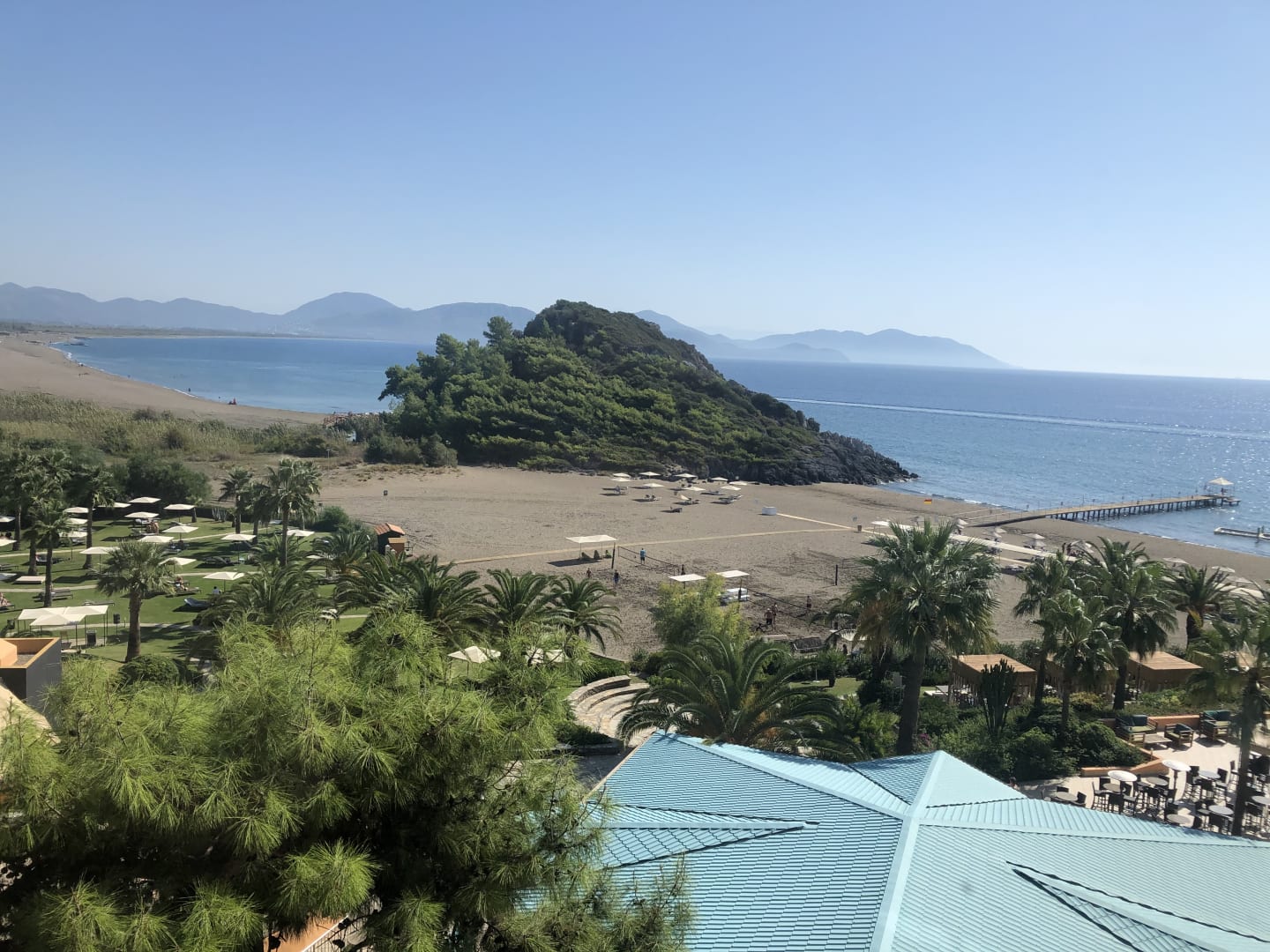 Ausblick aus unserem Zimmer im vierten Stock. Ein atemberaubender Blick über das Meer und die weitläufigen Gartenanlagen und Strandflächen des Clubs.