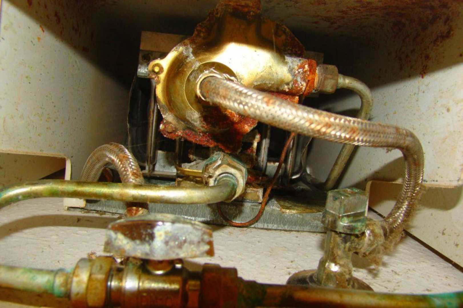 Gasboiler unten über der ArbeitsplatteWer den Warnhinweisen folgen wollte, musste den Gashaupthahn nach Benutzung abdrehen. Aber es gab mehrere Hähne. Eine Anweisung fehlte. Aber die Hähne waren auch größtenteils verrottet. Wer wollte da etwas anfassen und bewegen?