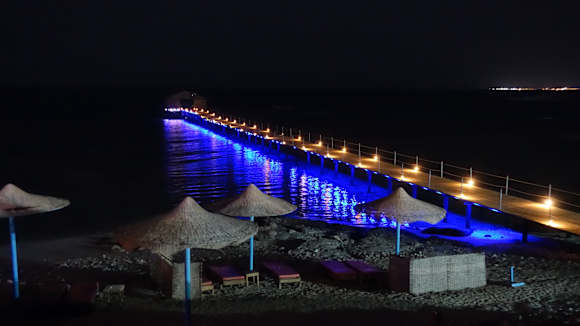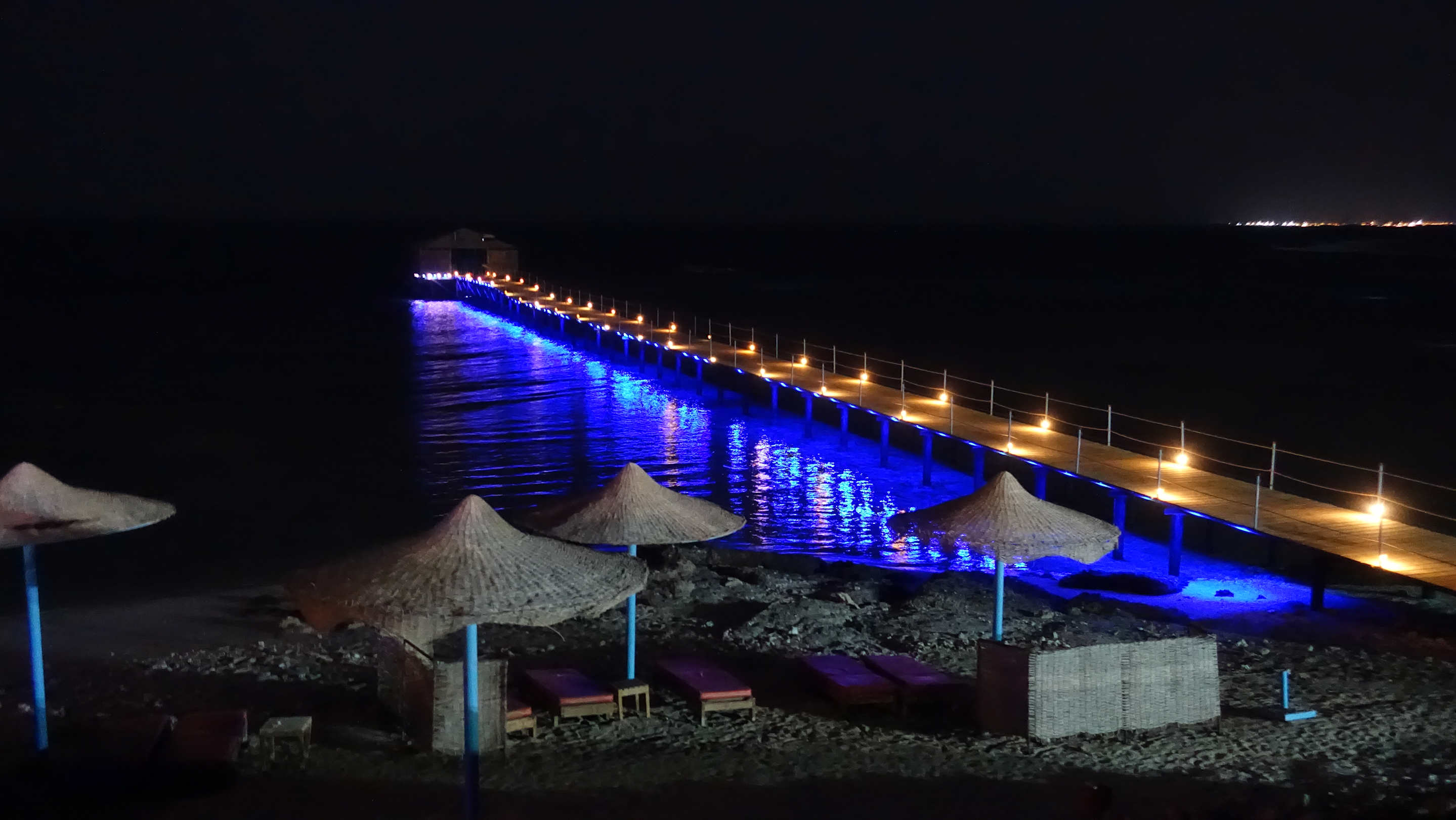Steg bei Nacht, Blick vom Restaurant.