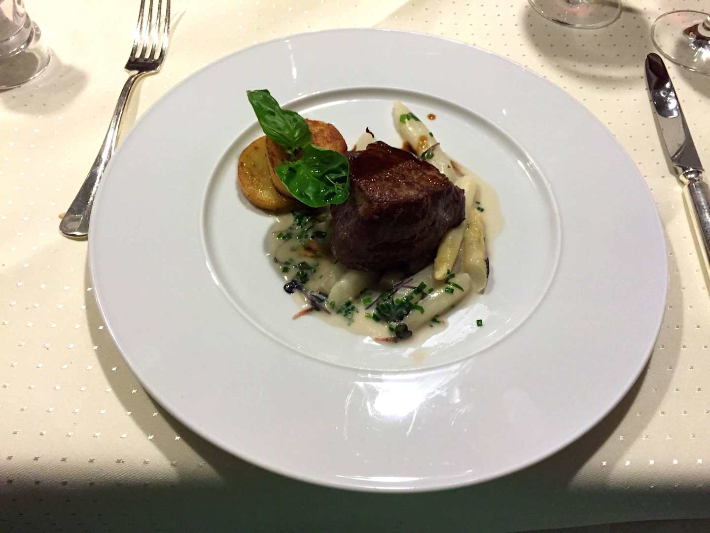 Spargelstücke mit Gartenkräutern , Filet vom Weiderind und Kartoffelplätzchen