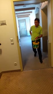 Personal Housekeeping (hat uns den Koffer hochgetragen) im Nebengebäude ohne Mundschutz