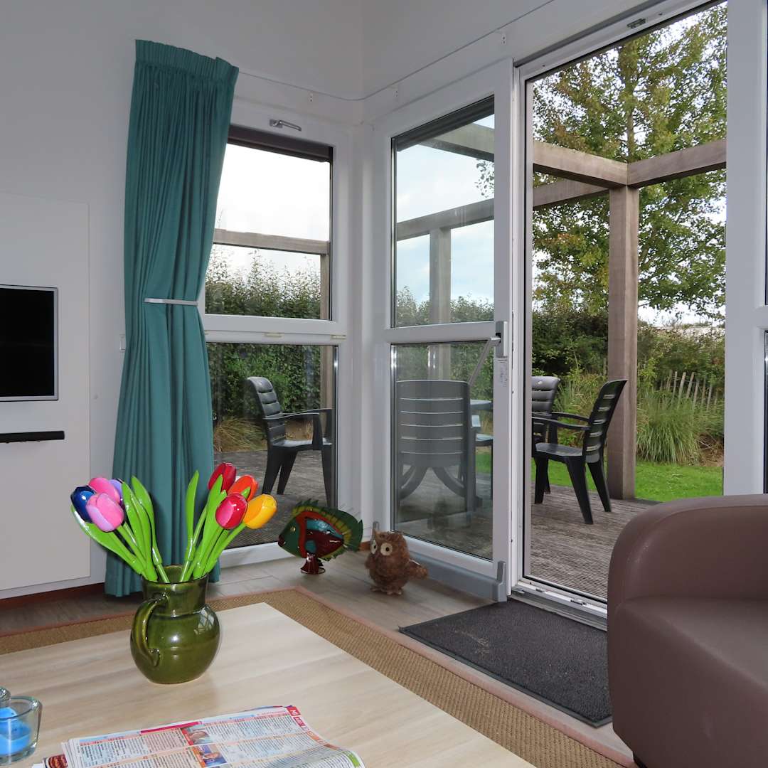 Blick von Wohnzimmer auf Terrasse.