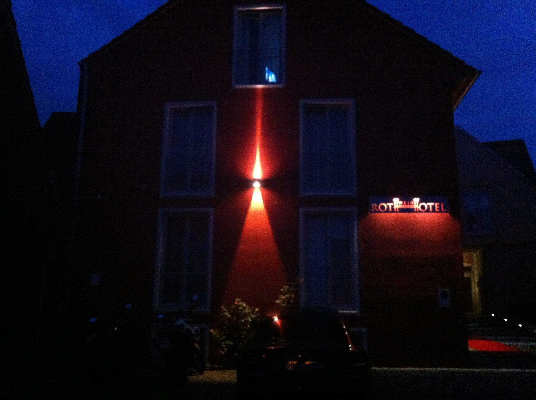 Von der Straße aus auf das rote Gebäude