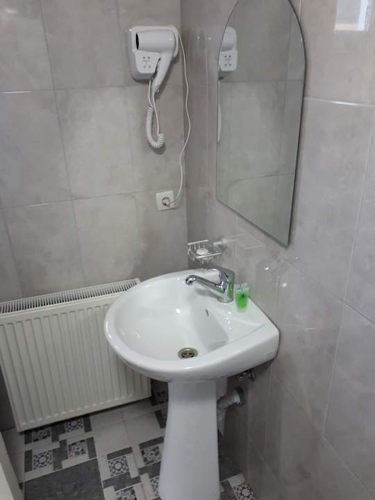 Bad mit Waschbecken und Wandfön