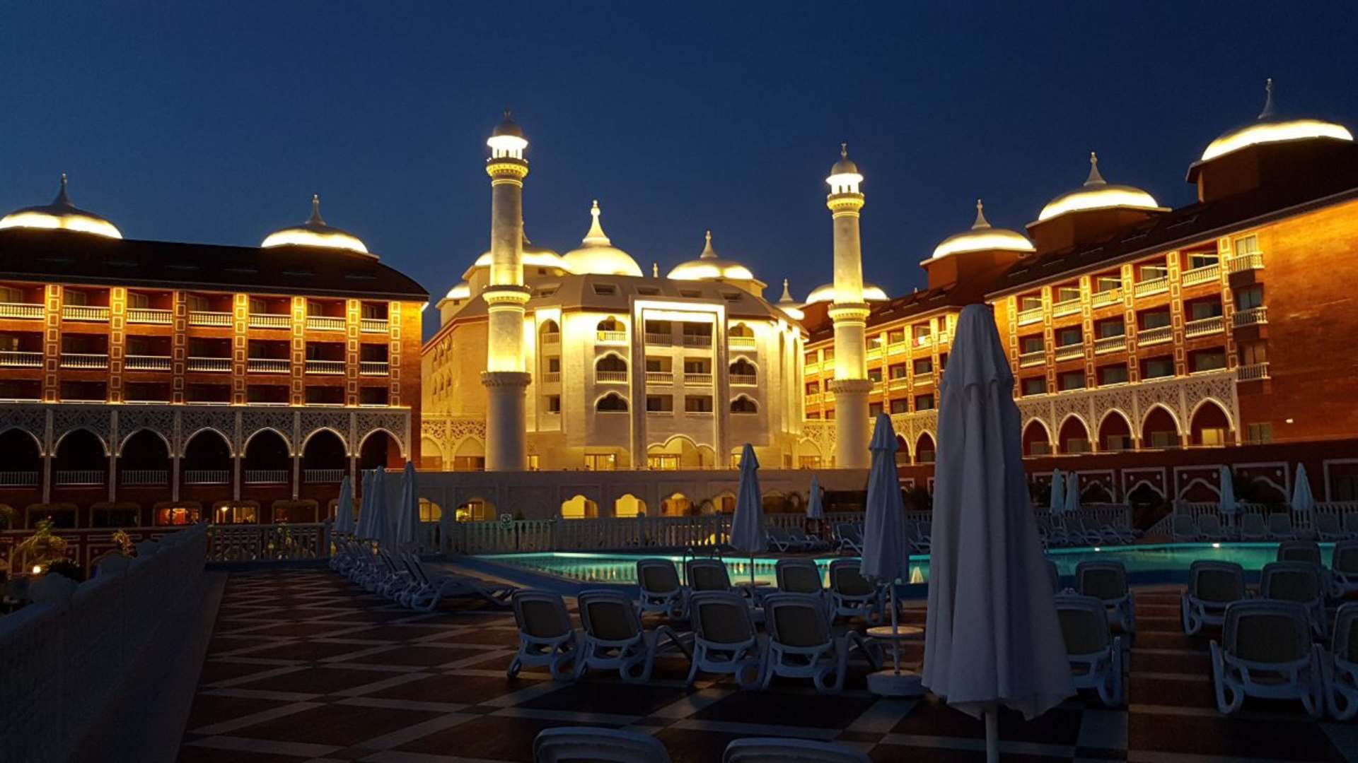 Pool und Hotel bei Nacht