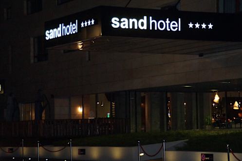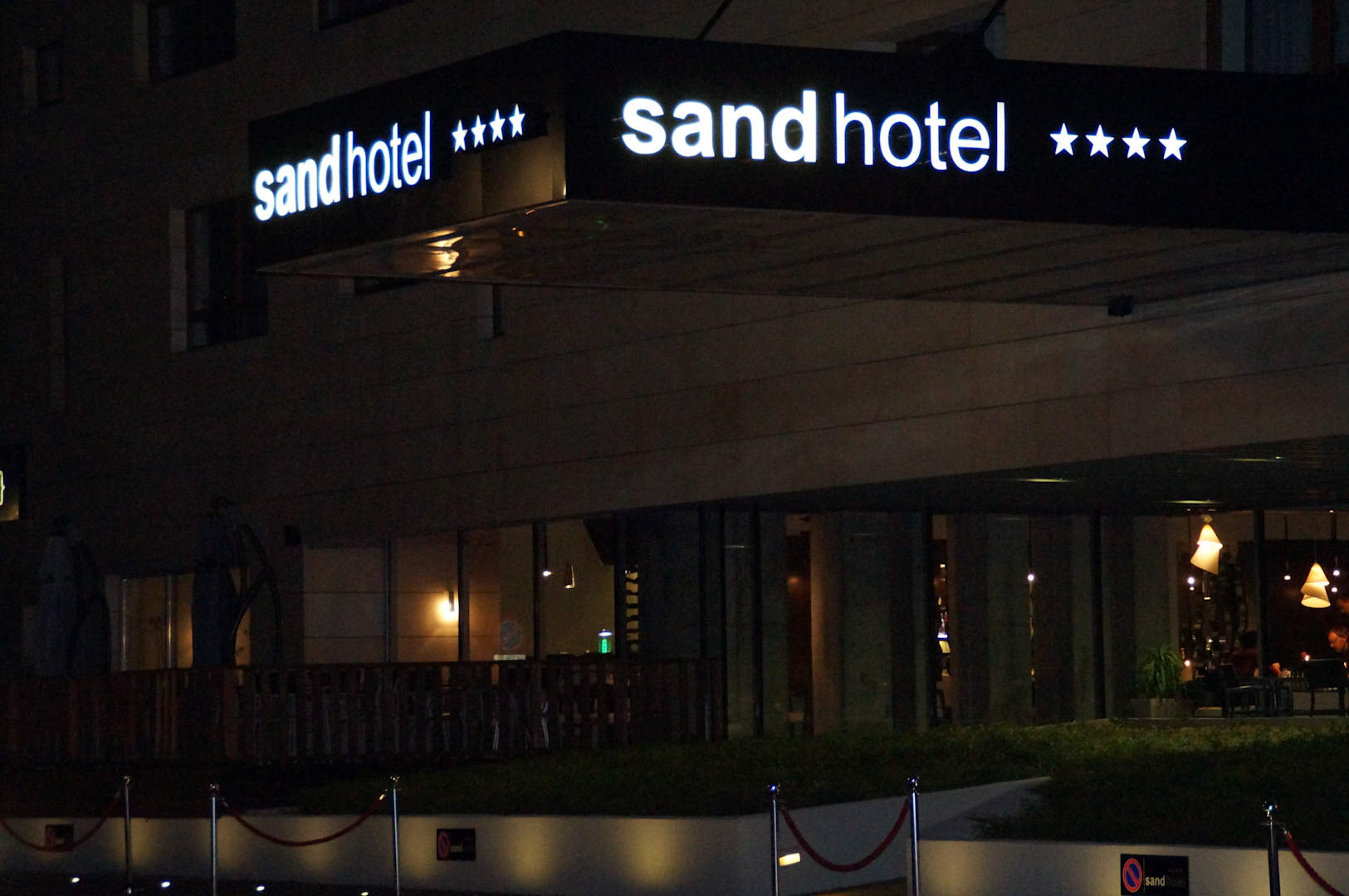 Eingang des Hotels bei Nacht.