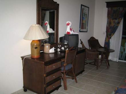 Genug Platz für alles. Unter dem Fernseher befindet sich die Minibar. Die täglich mit Sprite & Coca Cola aufgefüllt wird!