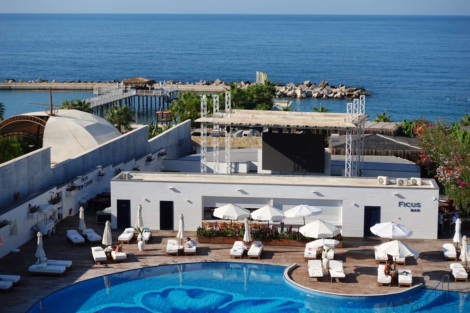 Ausblick vom Balkon auf Pool, Poolbar und Meer