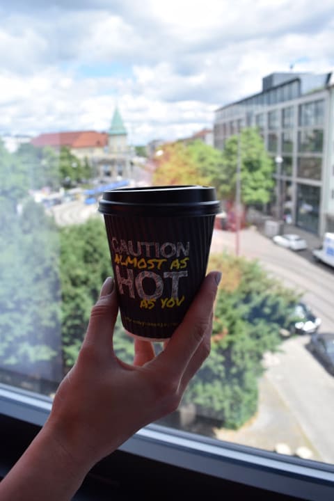 Blick aus unserem Zimmer auf die Straße. Es gab keine Mini-Bar im Zimmer, aber einen Automaten für Tee und Kaffee (gratis) auf dem Flur vom Hotel.