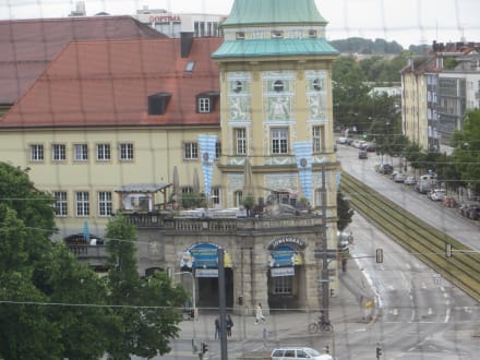 Blick aus dem Zimmer auf den Löwenbräukeller herangezoomt