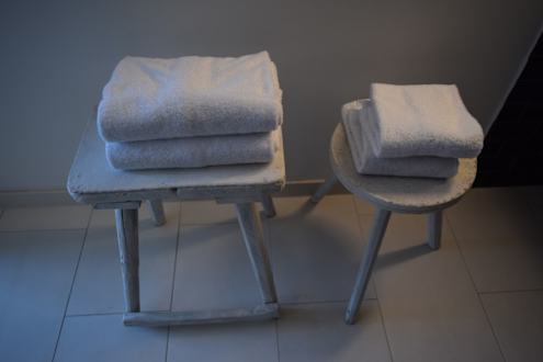 Handtücher auf sehr, sehr simplen und schon wackeligen Schemeln im Badezimmer zurechtgelegt