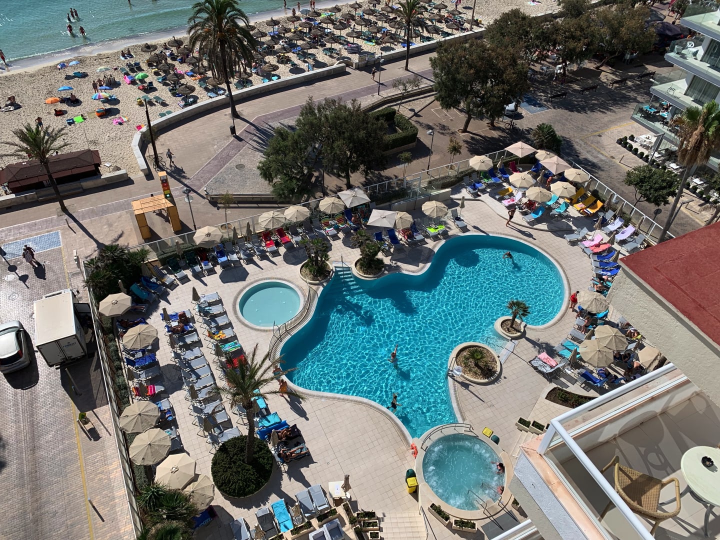 Ausblick von der Dachterrasse auf den hoteleigenen Pool