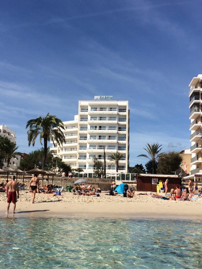 Blick vom Meer zum Hotel