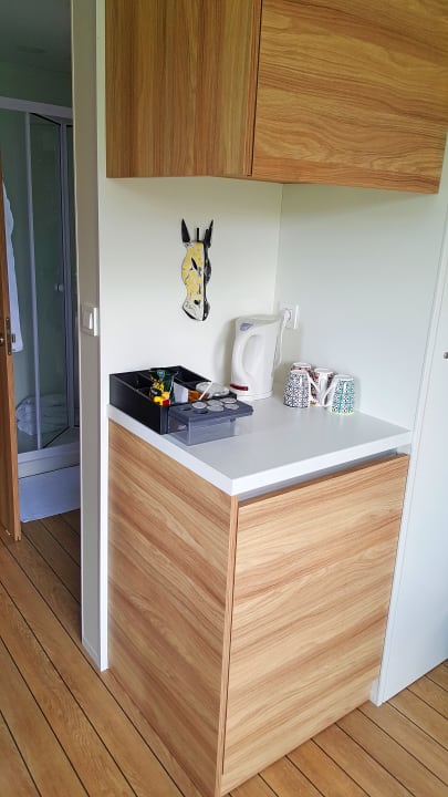 "Tee/Kaffee-Ecke" mit Kühlschrank (45qm-Mobilheim-Lodge)