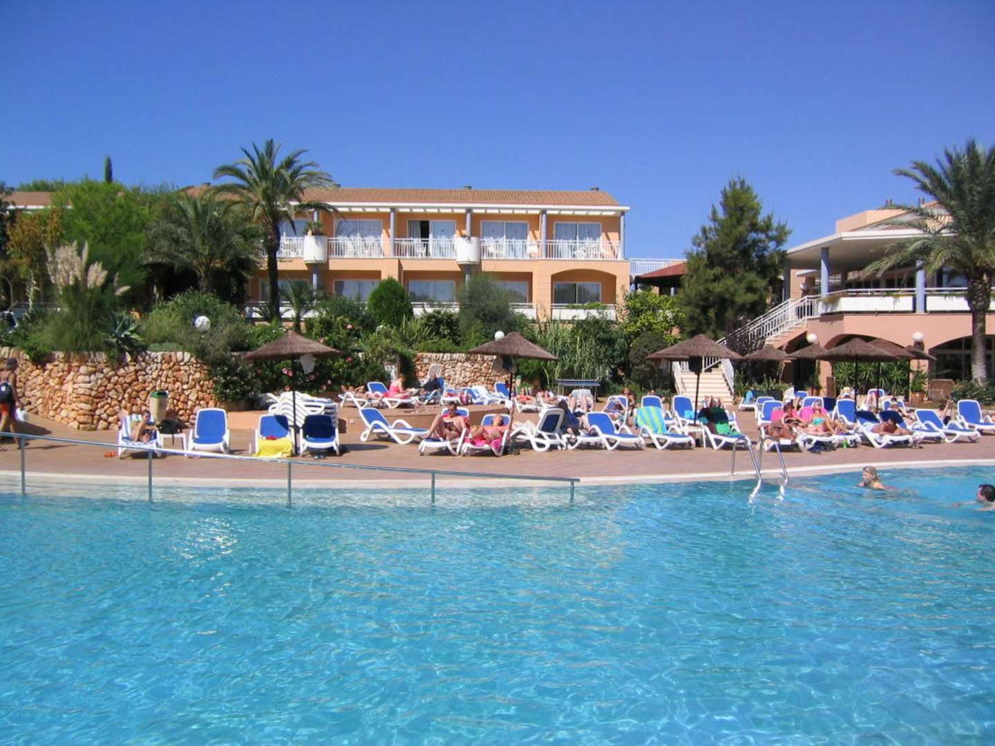 Blick vom Pool auf eines der Wohgebäude. Links unten Restaurant, darüber die Bar-