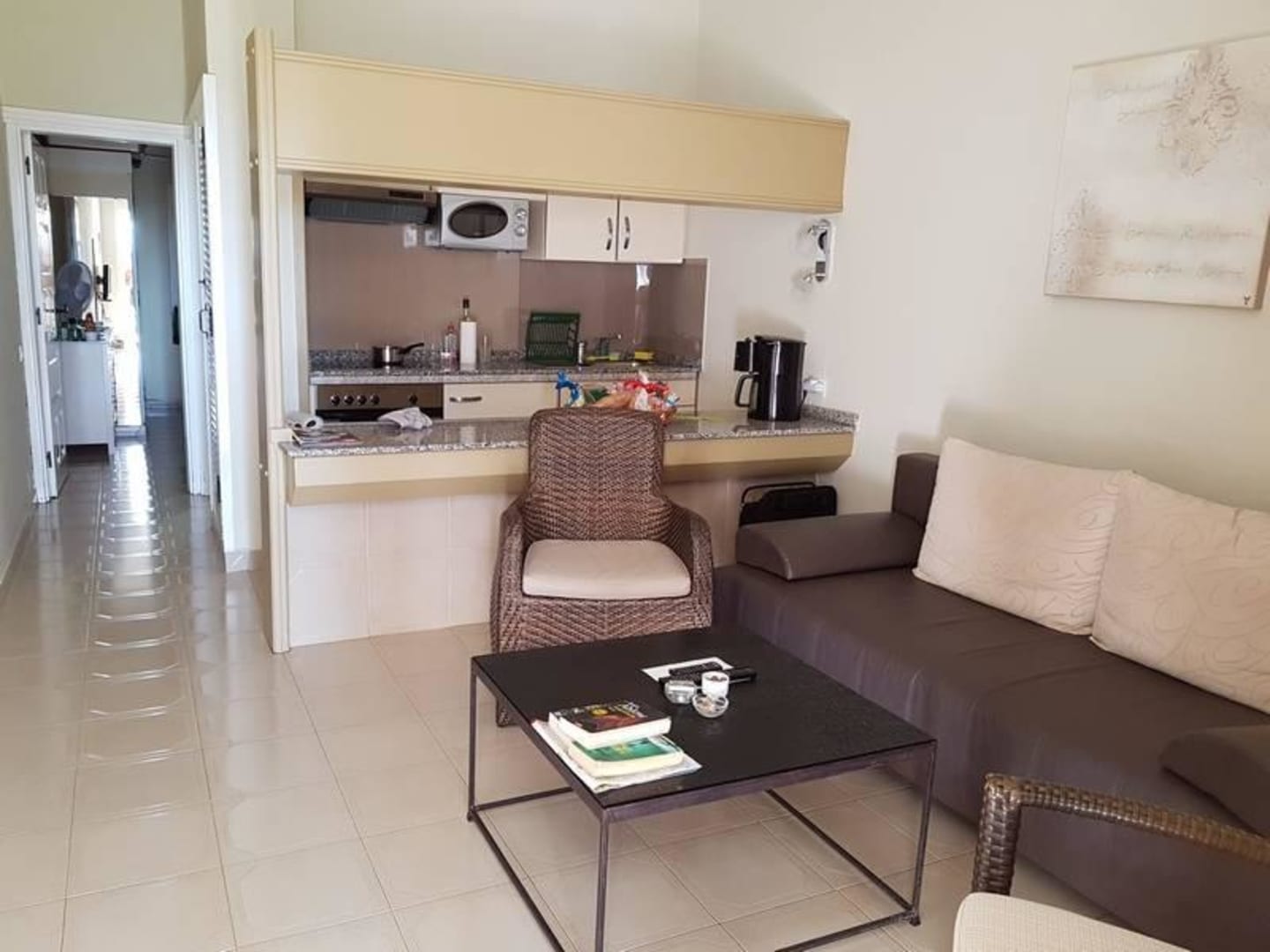 ZimmerHinter der Couch liegen die Auflagen für die Sonnenliegen.