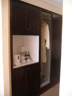 Im Eingangsbereich der große Schrank mit Tee- und Kaffeebereiter, Minibar - die natürlich auch als Kühlschrank genutzt werden kann - und Bademäntel.