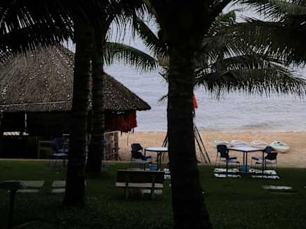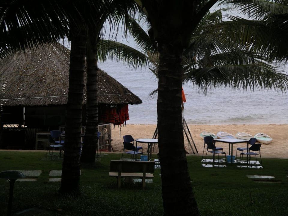 Man sitzt gemütlich im offenen Restaurant und schaut durch die Bäume hindurch auf den Strand mit der Strandbar.