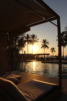 Gemütlichkeit am Pool mit Sonnenuntergang