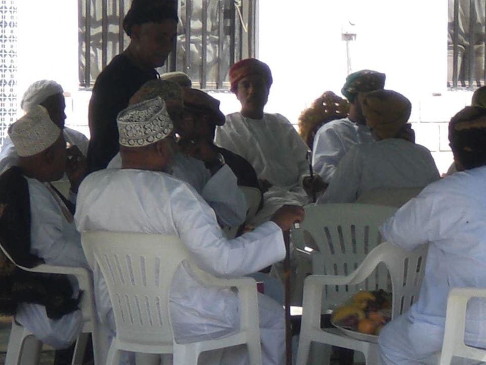 Der Vater und der Bräutigam sitzen auf einem goldenen Stuhl. Die Frauen feiern an einem anderen Ort
