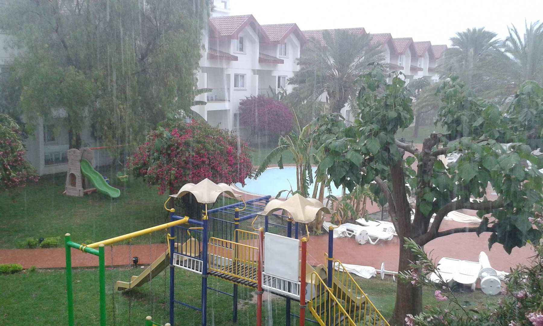 Blick aus dem Bungalow bei Regen