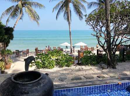 Ausblick über Pool und Strand