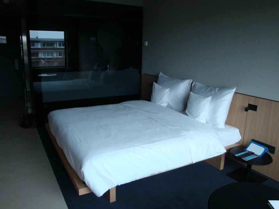 Im Hintergrund erkennt man die Glaswand zum Badezimmer