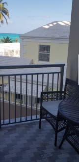 Der angebliche Übergrosse Balkon und Blick auf den Strand, das Meer und die Insel. So wollte man uns das Zimmer darstellen. Hier haben wir definitiv eine falsche Kategorie erhalten.